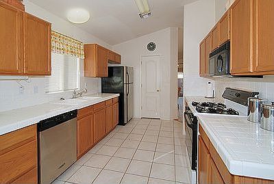Popular 3BR, 2BA split floor plan with large kitchen w/nook, dining area with dual fireplace to living room, large master BR with walk-in closet. All appliances included. Exterior newly painted. Mountain views, easy care backyard, two blocks from skate park and community pool. Easy access to I-10, Tucson Premium shops, dining and medical facilities.