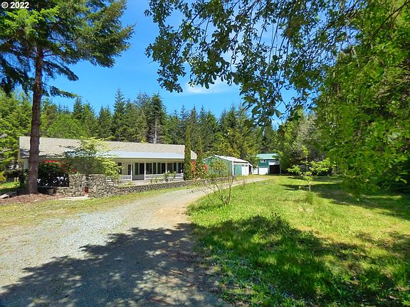 Excellent rural location south of Bandon. This is a private location with the 3 Bedroom 2 Bath Ranch Style residence. Features include a bright kitchen w/propane range-oven, tile counters, plentiful cabinet storage, main bedroom with a roll-in shower, jetted tub, covered back porch 2-Car Garage with workshop, separate spacious metal building for an RV, and boat. Roof was replaced in 2018, new siding on south side of residence.Wonderful location for the quiet, relaxing rural lifestyle.
