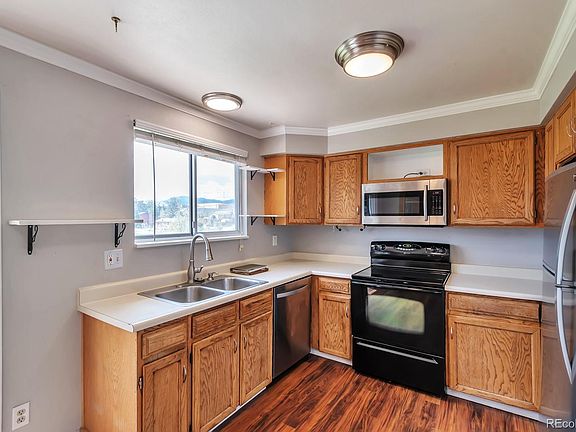 Spacious house on a large, cul-de-sac lot in Stony Creek! This home backs and sides to a green belt, allowing for sweeping mountain views and plenty of room to spread out. The location can't be beaten - close to Chatfield, highways, shopping, and restaurants. Tons of storage in the two-car garage, additional covered storage next to the garage, and a shed in the backyard. The interior of the home is just as welcoming as the yard. Character galore with the eye-catching cherry wood railing, wrought iron balusters, built-in china cabinet, and wood-burning fireplace. The kitchen includes stainless steel appliances, an eat-in space, a pantry, and access to the back patio for easy outdoor dining and barbecuing. The large master bedroom has mountain views, two closets, and a private sink and vanity.