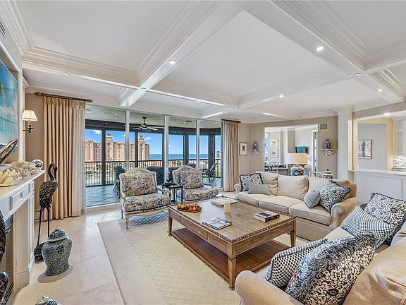 Gorgeous high-floor views. Enter this spacious and popular four-bedroom, 4.5-bath floor plan from your private foyer into an expansive living and entertaining space highlighted by floor-to-ceiling sliding glass doors, polished travertine tile flooring and an expansive screened-in lanai with electric rolldown hurricane barrier. The design has been cleverly modified to include a dedicated office next to the kitchen with outstanding light and views. The kitchen design features a built-out countertop, bright white cabinetry, stainless appliances and a separate breakfast table area. The spa-inspired primary bath features an oversized shower, dual vanities and dual water closets. Your friends and family can enjoy maximum privacy in three spacious guest suites, all with en-suite baths. Trieste is planning upgrades to common areas and residents enjoy a geo-heated tropical pool, fitness room, social room, library and staffed front desk in the lobby. Experience Bay Colony and Pelican Bay beach clubs, with attended beach services or work on your serve at the newly renovated Bay Colony Tennis Club.