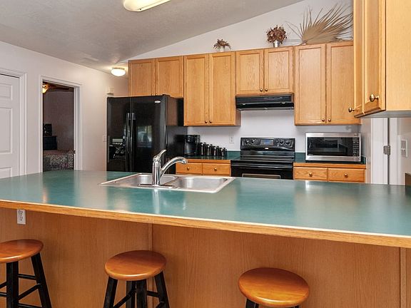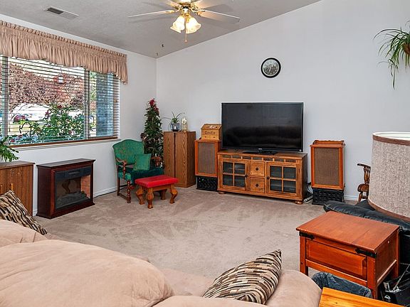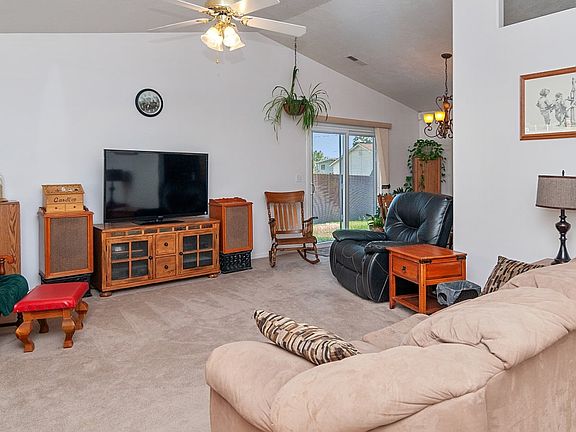 This one level home has an open spacious design with good size kitchen & dining room. Master bedroom is large with walk in closet. This residence has updated laminated flooring throughout the home, has a new sliding glass door, new water heater, updated shingles, large covered patio, and new carpet in bedrooms. Comes with central AC, wood blinds, updated appliances, private hot tub, auto sprinklers, RV pad, private fencing,and lifetime storage shed. Has great view of the mountains.