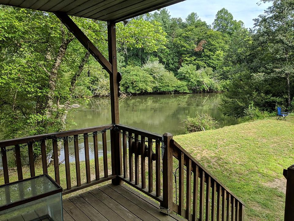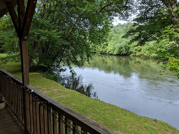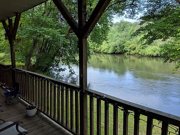 Little Tennessee River front home with 11'x41' porch overlooking the river, actually a stone throw away. 2 Bedrooms with a bonus room. Large master suite with french doors leading to the riverfront porch. Master bath has ceramic tile, walk in shower, 2 vanities and a garden tub. Living room has Gas log fireplace and cathedral ceiling. Ceiling fans throughout the home and insulated windows. Little Tennessee frontage homes like this one are hard to find.
