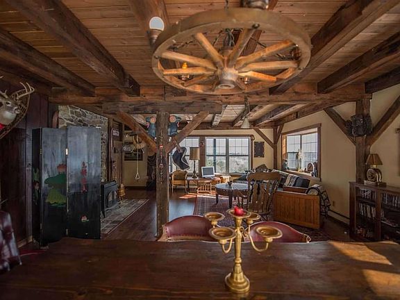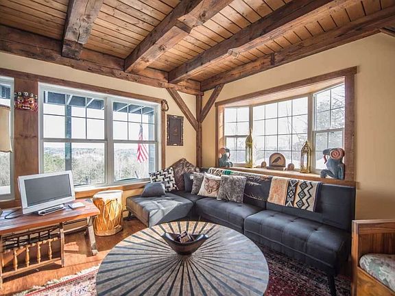 Private Mountain Top Lodge with breathtaking 180-degree views surrounded by town forest and wildlife. This vintage recently rehabbed post and beam lodge has an open floor plan downstairs with a wood stove in the great room/dining room, a kitchen fireplace, two levels of back porches for viewing the white mountains, a front porch for outside dining, full dry basement with W&D, two full baths, 3 bedrooms, (2 double sized with attached porch), 2 cozy day bed nooks for extra guests, gated driveway, satellite internet, garden shed, plenty of parking and complete privacy.