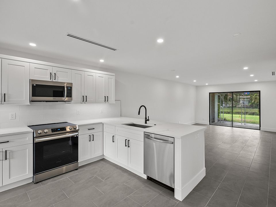 This beautiful, all new, completely remodeled, luxury villa has everything you deserve! New energy saving HVAC, air ducts, electrical wiring & panel. Neutral, modern & elegant designer selections begin with an open kitchen that flows into the dining & living area for easy entertaining. The smart kitchen design includes soft close cabinetry with molding, pantry, undercabinet lighting, tile backsplash, coffee bar, wine cooler & stainless-steel appliances. The 1st bedroom has a walk-in closet with ensuite sink & vanity. Laundry room is conveniently situated between the bedroom & bathroom. Choose the function of the 2nd room to fit your lifestyle, be it a den, office, or bedroom. Boca Lakes is a desirable 55+ gated community located in the heart of Boca Raton, close to shopping, dining & more