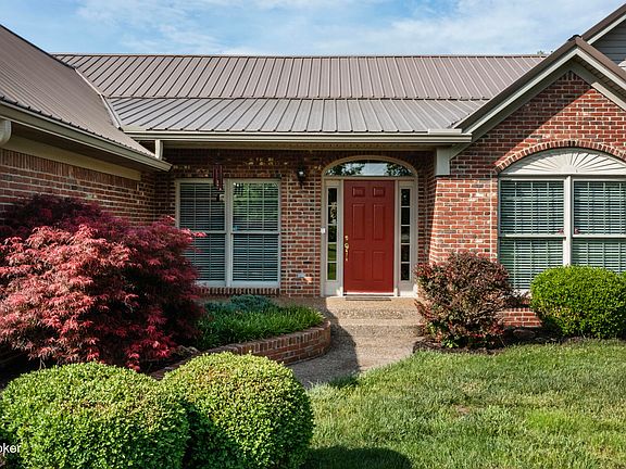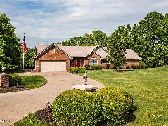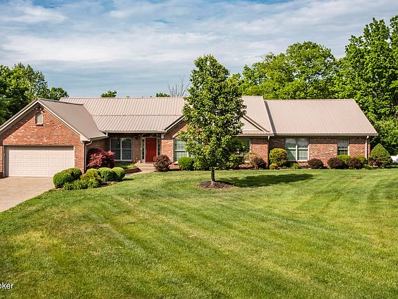 Welcome to this single owner, custom built home in a beautiful rural setting. This is one of the most charming pastoral mini farms you may find in Henry county, KY. This quintessential property of 4.969 acres is located one mile east of the Oldham/Henry county line making it close to all that Lagrange has to offer but with much lower property taxes. It is also one mile off of I-71, exit 28, making it easily commutable to Louisville, and yet, it offers all of the benefits of country living. The property consists of a Ranch home with just over 3,000 square feet, two out buildings, and a lake that is fully stocked with several types of fish, and that is ready for fishing, paddling, kayaking, and swimming. The single family, four bedroom, three and one half bath, two car attached garage, brick home has a laundry/utility room with a half bath, and has a 1.5 year old metal roof and new 4 inch gutters. It consists of a country kitchen with a large family dining area that is open to a great room with vaulted ceiling and gas burning fireplace; a wonderful space for gathering with family and friends. The kitchen and family dining area are also connected to the sunroom which is an all season room with sliding glass doors and screens with peaceful views of the lake and surrounding trees and flowering bushes. This home has a great floor plan (see attached). As you enter the foyer you are greeted with warm wood flooring, a formal dining room to the left, just steps from the kitchen, and a den/office complete with built-ins to the right. The primary bedroom has a large walk-in closet and an ensuite primary bathroom with double vanity, a jacuzzi tub and separate shower. There is also another bedroom and a full bathroom off of the hallway along with a bonus room. The bonus room provides access to a mother-in-law suite but the space can also serve a number of other uses. The mother-in-law suite consists of 2 large bedrooms (2 of the 4 total), one bath (1 of the 3.5 baths), a living/dining area, and a kitchenette, all with handicap accessibility, and a separate private entrance.