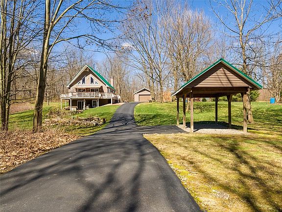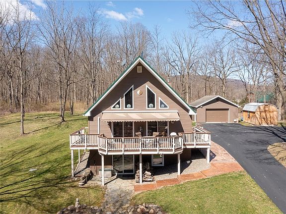 UNSURPASSED VALUE....Chalet on 5 beautiful and usable acres, walking paths throughout.. Updates since 2020 includes, Kitchen appliances (except refrigerator which will be switched with the stainless steel currently in garage) The mounted TV's are included, new septic system, beautiful Oak kitchen, soft closers and adjustable shelves that pull out. Rose granite counters, 1st floor luxury vinyl plank flooring, 2 Mitsubishi wall mounted units for air cooling or heat. Enclosed rear yard wood fence perfect for your children or doggies, 19x10 front deck with Sun Setter awning, deck was just treated with "Deck Over", perfect protection system finish. Beautiful rebuilt Oak Staircase to lower level complete with rich oak storage cabinets underneath. Every wall and ceiling offer earthtone fresh paint job. Property is located a stone's throw from Reservoir Creek Golf course. Detached 2 car garage, 2 storage sheds, picnic pavilion. Fresh blacktop driveway in great shape. New metal roof, security system. Delayed negotiations begin 4/15/24 at 5pm, Square footage is to be updated as per assessor 7/1/24 tax rolls to 1900 sq ft, agent verified number using a tape measure.