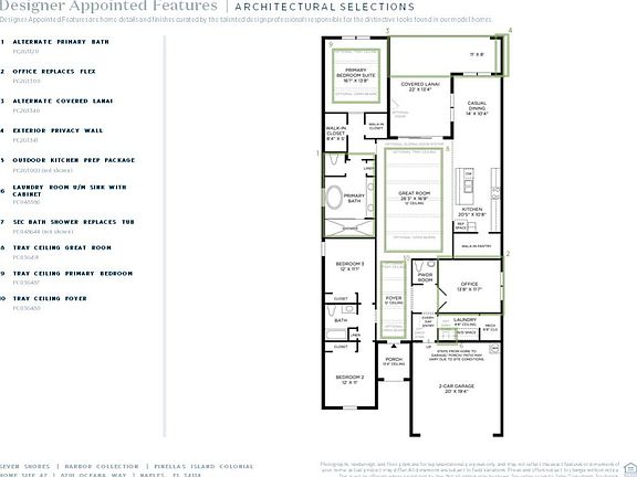 The Pinellas Island Colonial is an impressive single-story home with a modern, open floor plan and elegant upgrades. A grand entryway opens into a spacious great room and a covered lanai, ideal for enjoying the outdoors. The well-equipped kitchen features a large island, generous counter and cabinet space, and a walk-in pantry, all adjacent to a cozy dining area. The secluded primary suite is a retreat with dual walk-in closets and a spa-like bath with a large shower and dual-sink vanity. Two additional bedrooms share a bath, and the home offers a flexible room, a powder room, and ample storage space. Disclaimer: Photos are images only and should not be relied upon to confirm applicable features.