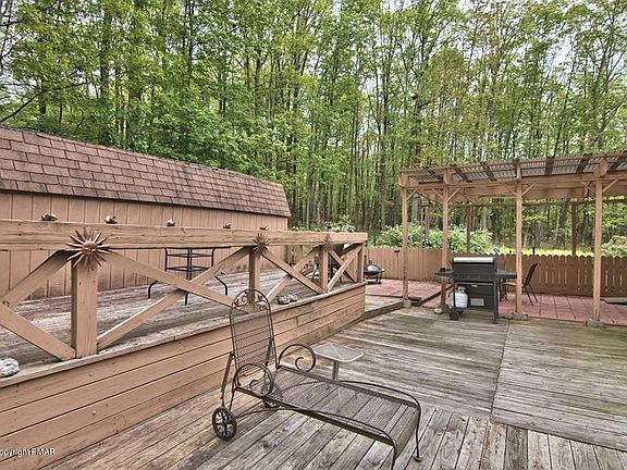 If you are looking for a large Master bedroom than this home is for you.The entire second floor is your master retreat. Need Closet space, there are 4 closets in the master plus a master bath with soaking tub. A picture is worth 1000 words, check out the photos. The custom bedroom set is included . The main floor is open concept with a large kitchen island and walkin pantry.A second bedroom is on the main floor and is presently used as a laundry room.The well maintained home has PEX and PVC plumbing. Gutters are leaf free with the Gutter Pro system.There are TWO large sheds that can accomodate all your toys. HIs and Hers? The home is on a double lot within walking distance of both the fishing and swimming lakes.Pocono RACEWAY, waterparks and ski resports are all nearby.