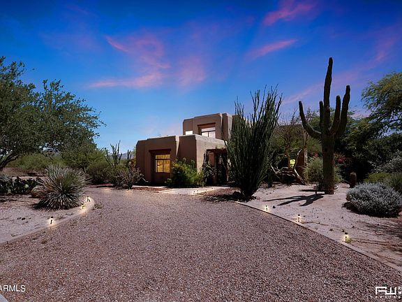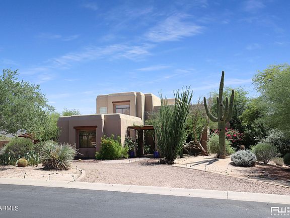 Motivated Seller! Southwest Style home sits on a spacious lot in North Scottsdale. A natural desert front boasting multiple fruit trees, and desert plants. The backyard is made for entertaining, dining on the covered patio, swimming in the sparkling pool with a waterfall, putting green, BBQ with seating, fireplace, dog run with a 6x8 shed with electricity and let's not forget the mountain views. There are 4 bedrooms, and 3 full baths. The downstairs office/den has a hidden bookcase door leading to a bedroom. (The bedroom downstairs could be converted back into the 3rd car garage and den to its original bedroom.) Home needs some TLC.