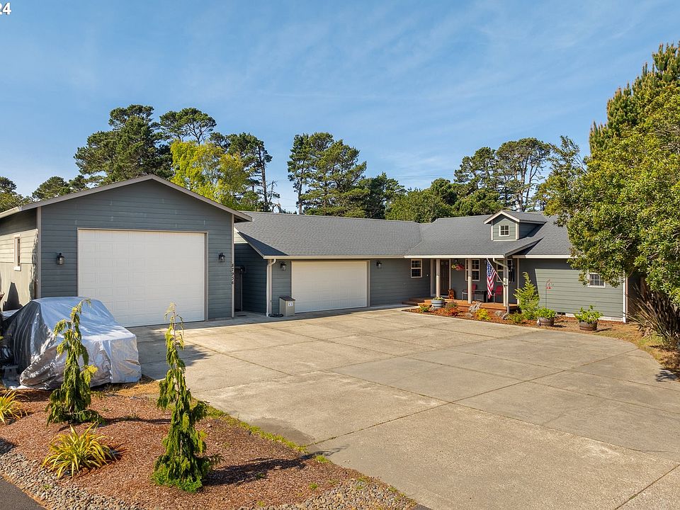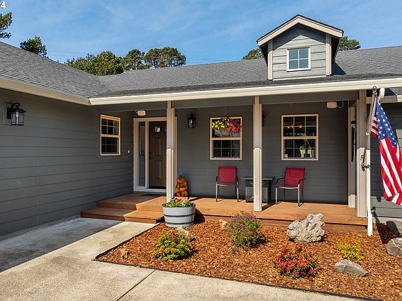 This beautifully updated home in the highly sought-after beach area community of Idylewood welcomes you with a well-designed split-floor plan that warmly greets you as you walk through the door with a wood-burning fireplace, vaulted ceilings and plenty of natural light from large windows and a sliding patio door. The galley-style kitchen is a chef's delight, with plenty of counter and storage space, a new dishwasher, a deep sink, countertop lighting, and a new cooktop. The primary bedroom suite features a sliding door to the back porch, a walk-in closet, a double sink vanity, and a shower tub combo. The entire home features 36" wide doorways, hot water circulation throughout, new high-end waterproof vinyl flooring, a newly painted interior, and new screens for the sliding doors. Both bathrooms have new faucets, and both showers were smartly designed with water mixers to deliver balanced and comfortable temperatures. In what feels like their own wing of the house are spacious second and third bedrooms split by the hall bathroom between them. Finishing off the well-designed interior of this home is a large laundry room with a wash sink that leads to the attached two-car garage with all-new LED lights and an automatic door. The amenities of this almost half-acre property continue with new paint on the home's exterior, a large driveway, and a detached 24'x40' garage/shop with a bonus room. A covered back porch and patio, a partially fenced yard, and plenty of parking for all of your outdoor toys make this the perfect home to live and play in the coastal wonderland we call Florence.
