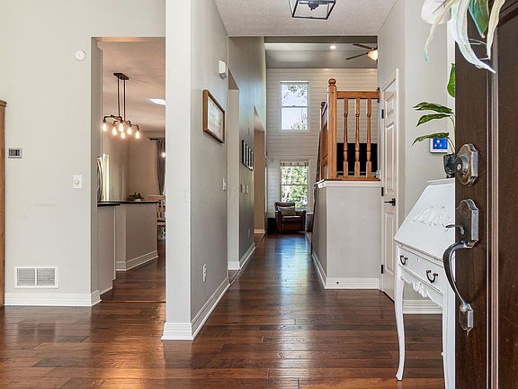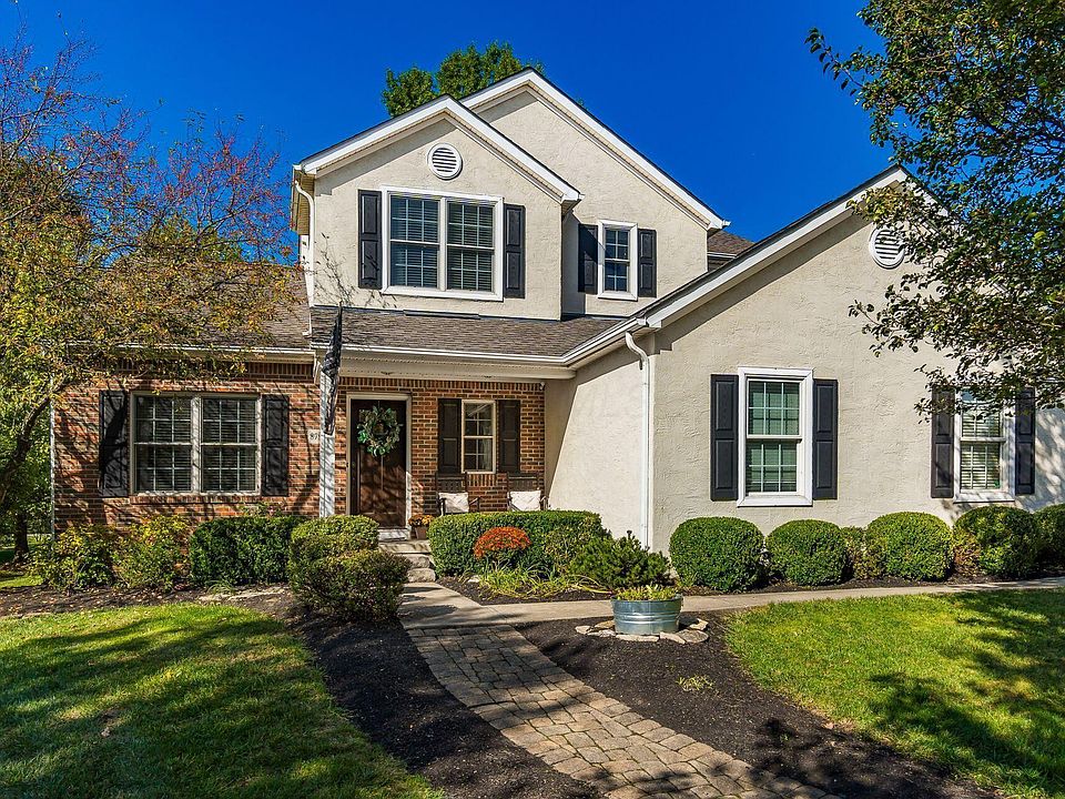 Welcome to this beautiful & well-appointed home in the highly sought after Golf Village neighborhood of Powell in the Olentangy School District! Completely updated throughout, this home boasts tons of natural light, high ceilings, open concept & wood flooring throughout entry level. The updated white kitchen features granite countertops, stainless steel appliances including new dishwasher and refrigerator, & island overlooking eat-in dining space which opens to expansive patio and two-story great room. Sliding doors lead to patio overlooking park-like private yard with sophisticated landscaping, custom gas firepit and gas grill hookup with TV mount - perfect for entertaining! Relax in front of your gas fireplace adorned by beautiful great room feature wall, or entertain in the huge finished basement with multiple living areas including theater space, bar, fitness area, play room and includes rough-ins for full bath & wet bar! First floor Oversized Primary is complete with en-suite, offering dual vanity sinks, tile shower, soaking tub and walk-in closet. Upstairs you'll find 3 bedrooms and large shared bath with dual vanity sinks and updated flooring! You will love the new AC (2025), new hot water tanks (2021), new basement carpet (2021), First floor laundry with new Washer and Dryer, ample closet space, pantry, side load 2-car garage and more!