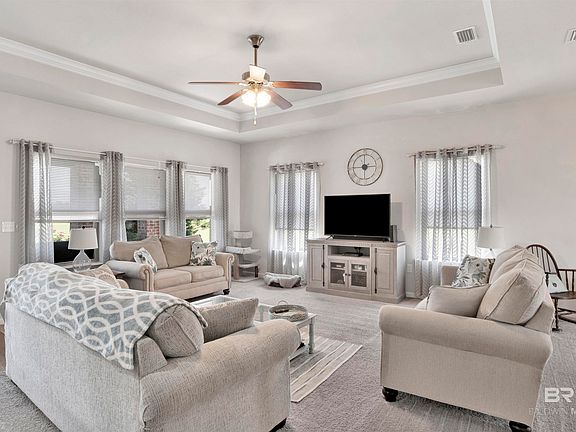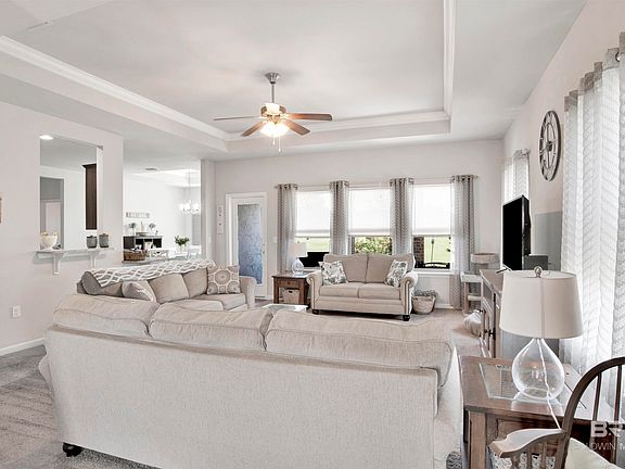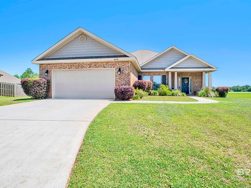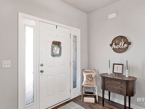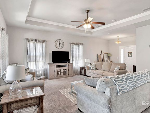 Meticulously maintained home situated on a cul de sac just 20 minutes north of Gulf Shores. Gold Fortified home built in 2016. Great floor plan with no wasted space yet everything you need. Granite countertops throughout, carpet and vinyl plank flooring. Well laid out kitchen with stainless appliances, undermount sink an small breakfast bar. Primary bedroom located on back side of the home. Double vanities in bathroom and private water closet. Tray ceilings for custom touches. Spacious walk in laundry room, Double Garage, and covered oversized back porch overlooking a sod farm. Small grilling patio as well. Brick exterior for low maintenance and hurricane netting for window protection. This is a fantastic home in a small established neighborhood!