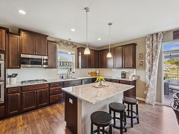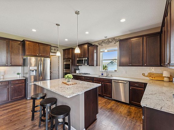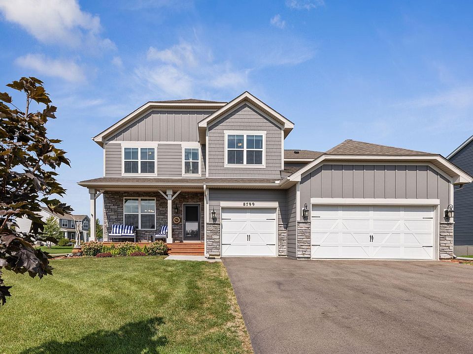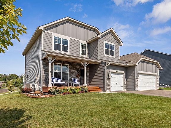 This Spacious and charming open-layout home is the very popular "Jordan" design. The upper level comes with 4 bedrooms, a loft & laundry. All bedrooms on the upper level have walk-in closets, and the primary bedroom has 2 walk-in closets! On the main level there is a 5th bedroom along with a 3/4 bath! It also has easy-close blinds, irrigation, a 3-car garage, and a nice maintenance-free deck with storage below and a pergola above. There is even room to grow with the unfinished basement. This home is just a few blocks away from the new elementary school and plenty of walking paths in the heart of Lakeville!
