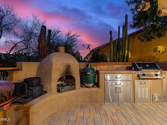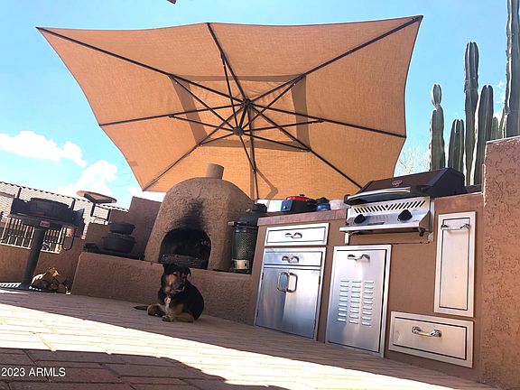 Gorgeous home w/Casita in Mountainbrook Village! Desert landscape, front patio w/stunning mountain view. Vault ceilings, bedroom carpet, designer painting, tile flooring & plantation shutters throughout. 3 bathrooms w/3rd bedroom Casita opening to patio. Multi car garage includes builtin cabinets w/laminated worktop & attached 8' utility garage for trailer/golf cart, Plenty of outdoor seating in beautiful back patio setting w/powered retractable cantilever sun cover & huge umbrella over gas & electrified outdoor kitchen surrounded by pavers featuring numerous stainless steel cabinets. The inside kitchen has stainless appliances w/gas range, dishwasher & dual refrigerators, includes an expansive adjacent pantry, w/matching cabinetry w/numerous under counter pullout shelves. & lengthy quartz counter top & a large additional stainless sink w/disposal. A builtin desk plus under-counter front loading washer/dryer completes the suite. Skylights in kitchen & bathroom for natural light. Dbl-door to main bedroom w/patio access, en-suite, dual sinks, separate garden tub/shower & 2 walk-in closets. Secondary bedroom w/generous sitting area.
