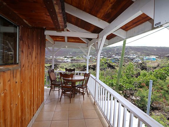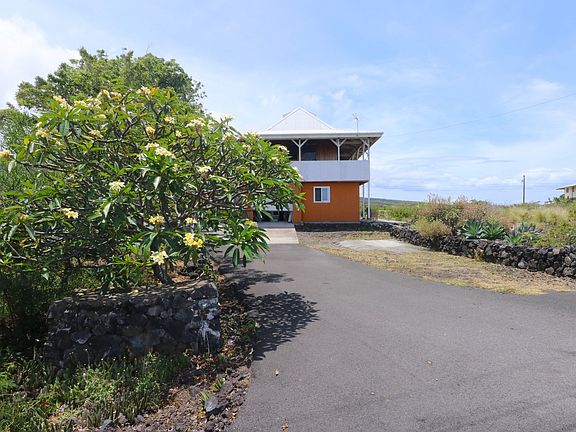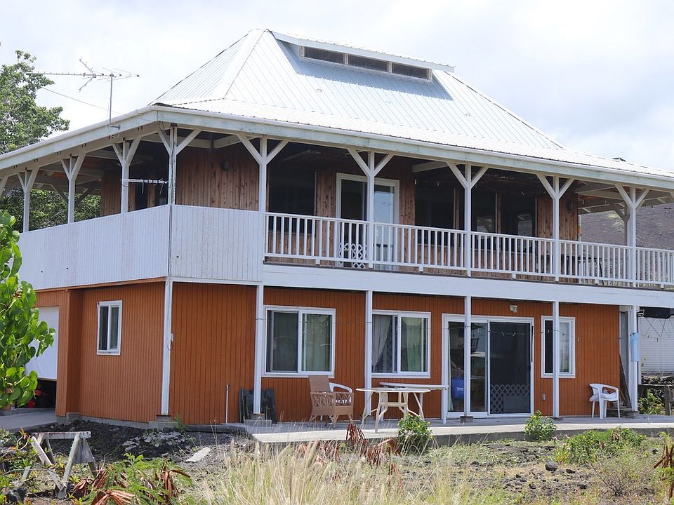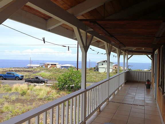 Original owner 2bed/2bath two story custom home at the ocean boasting lovely sunset horizon views! 2 unit configuration! Totally off-grid oasis features a separate living unit on each floor comprised of 1 bed/1 bath, kitchen, and living room. The upper level is fortress-like, built with 2 inch thick cedar walls and ceilings, thick open beams (a possible loft area) with high cupola for cool ventilation. There are the enduring gorgeous Brazilian Cherry hardwood flooring and windows trimmed with mahogany sills to appreciate. The upper floor bath is complemented with an easy access step-in shower stall, porcelain pedestal sink and toilet. The tiled wrap-around lanai with ocean views is accessed by a Trex-style low maintenance staircase. The lower level unit is much newer with large modern kitchen built with mahogany cabinets, solid slab Rainforest marble countertops, tile flooring and all major appliances. The living and dining area is porcelain tiled throughout, keeps the space cool. The exceptional hand crafted bathroom features a custom step-in shower with built-in seat and toiletry shelves, and continuous tiled floor for easy care, and use of rich hardwood trims. The useful tiled craft room separates the living areas from a light and airy bedroom. This unique home is totally off-grid utilizing PV solar panels, Outback Power Inverter, battery bank, solar hot water heater, and propane stove, along with a gas generator for backup power. The upstairs wrap-around tiled lanai provides beautiful ocean views, as does the long cement patio area on the south side of the home. A one car garage is a wonderful addition, and rounded out with a paved driveway and front rock walls.