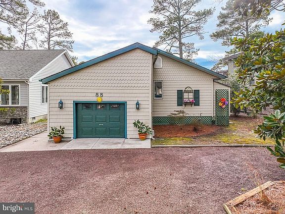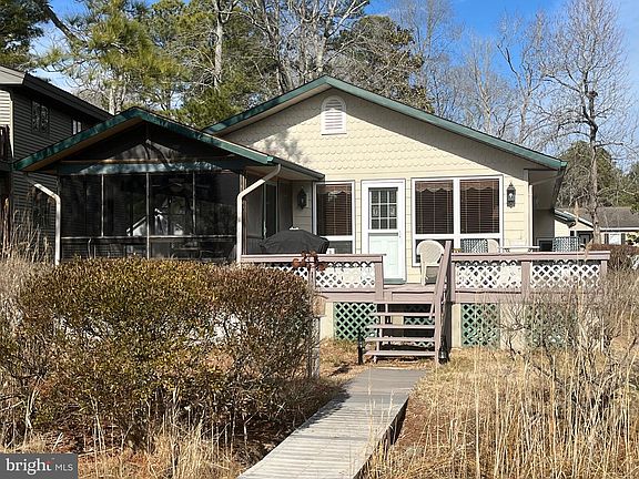 WATERFRONT WITHOUT THE EXTRA FEES!! Located on peaceful, serene Manklin Creek, frequented by wildfowl, herons, and other shore birds for your viewing pleasure! This ranch style home is loaded with surprises, from the decorative vinyl shake and gingerbread accents, to the beautiful wide plank knotty pine floors and natural wood trim. The living area contains exposed beam ceiling, and the primary bath has wood ceiling and walls. A very impressive 28x12 screened porch includes a vaulted ceiling with 4 skylights, 2 ceiling fans & a porch swing. Plenty of room to enclose all or a portion of it, the foundation is already in place. Feel free to relax on the sun deck or your private maintenance free boat dock with sitting area. There is an optional bonus room over the one car garage, which has two large workbenches. HVAC replaced in 2022. Waterfront property at this price is difficult to find, don’t wait on this one!