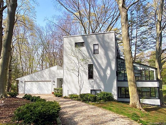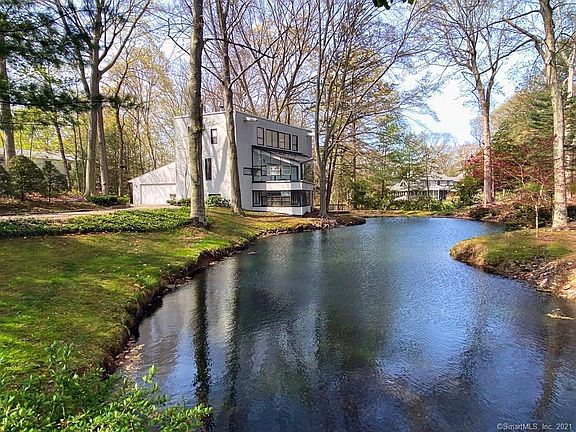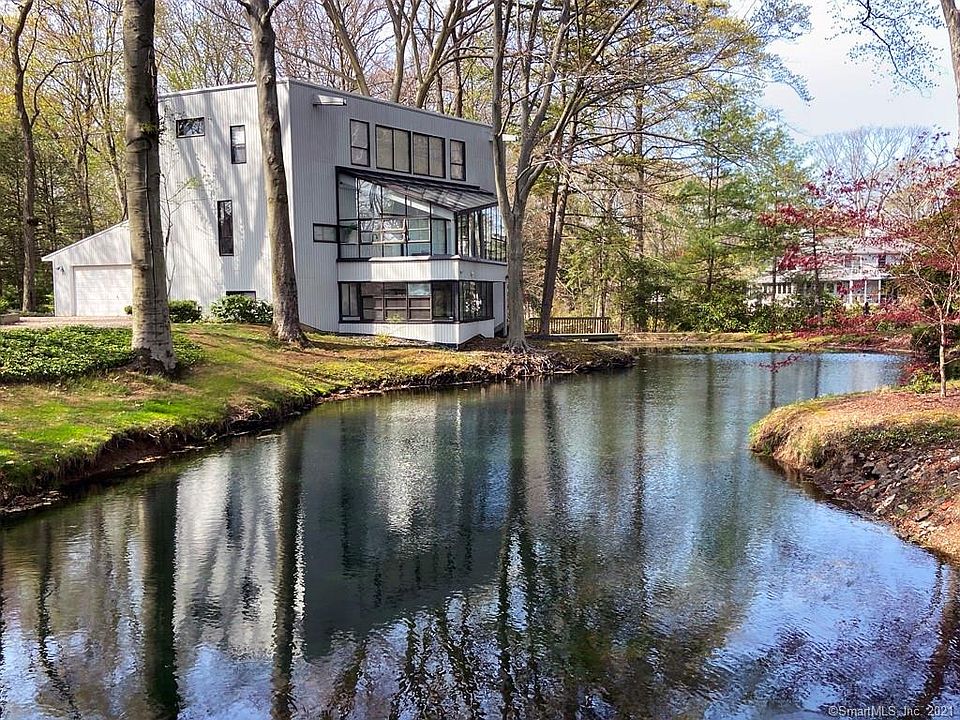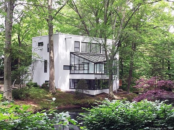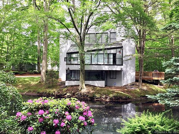 Remarkable 3 bedroom 2 full bath Contemporary pond-side home on three levels. There are stairs. One of a kind. Lush green .75 acre private setting. Large cooks kitchen with breakfast island. Designed and built in 1969 by noted Architect and Yale School of Architecture Professor Donald Baerman for his family. Clean lines and stark minimalism defines this delightful space. Formal living room and dining room lead to a dramatic sunroom/atrium overlooking the pond. Lower level with family room, office, bedroom and full renovated bathroom. Enjoy a second sunroom/Atrium dining area. Gas heat, central air, three car garage, large deck for enjoying the sound of the waterfall. Come see. Newer roof. No flood insurance