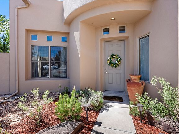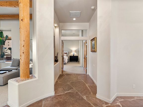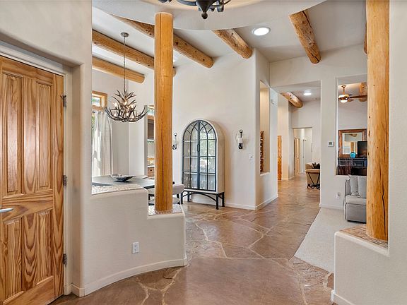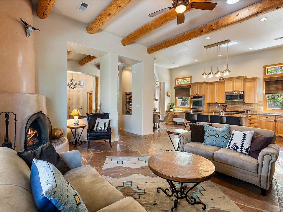 Rarely available 5 bedroom, 3 bathroom home in Rancho Viejo with multiple gathering spaces inside and out is calling you home! This was the model home and you will know why when you step through the front door. Elegance, warmth, and charm abound in this single level (no steps!) abode with high ceilings with vigas, gorgeous flagstone flooring, kiva woodburning fireplace, two living areas, and two dining areas. The grand entry foyer welcomes you into this beautiful and well-maintained home with great separation between the gracious primary bedroom suite and the four guest bedrooms. One of the guest bedrooms is its own suite with patio and separate entrance, perfect for guests wanting to come and go as they please. The additional guest bedrooms provide space for offices, exercise rooms, or whatever best suits your lifestyle. Unleash your inner chef in the stunning and functional kitchen that includes an island with bar seating, upgraded cabinets, and granite countertops. The grand rear portal is a sanctuary for outdoor living and entertaining, with Saltillo tile flooring and views to the lovely rear yard with firepit, which is fully enclosed and offers wonderful southern views of the Ortiz Mountains and the Galisteo Wave. Bask in the quiet privacy of your outdoor retreat, perfect for bird and butterfly watching and taking in Santa Fe’s incredible sunrises and sunsets. In-floor radiant heat and central air conditioning will keep you comfortable year-round. Additional features include wonderful natural light via clerestory windows and sun tunnels, attached 2 car garage with direct entry, separate laundry room, and close access to the Rancho Viejo trail system. $53K in seller upgrades include a new roof silicone coating in May 2025 with a 25-year transferable warranty. Don’t miss this stunning and inviting home in a coveted location!