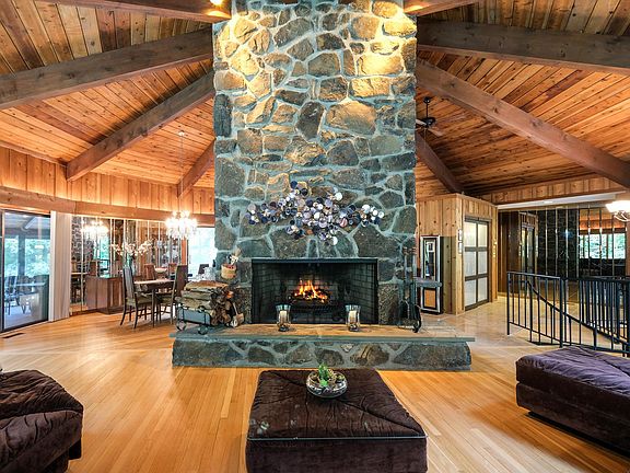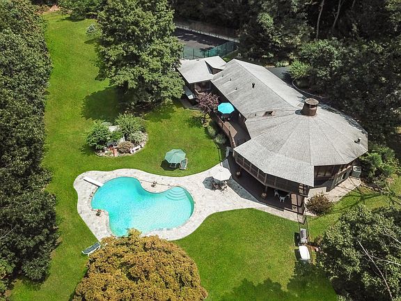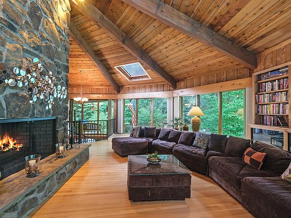 Tranquility abounds- a one-of-a-kind custom-built mid-century modern home beautifully situated across 3+ private acres. An architecture style unlike any other showcasing board & batten siding, a great room with vaulted cedar ceiling, wrap-around floor-to-ceiling windows and central hearth crafted using stone from the property. Enjoy immediate access to the outdoors through multiple doors on the upper-level decking for true indoor/outdoor living. Primary suite includes en suite bath, oversized walk-in closet and personal balcony overlooking park-like backyard. Lower-level offers custom built-in bar, cedar sauna, bonus room, and direct access to pool patio- a true entertainer's delight! Walkout and hike the Briarcliff Peekskill Trailway or stay in and enjoy a hot sauna & cozy fire! Specimen trees adorn the lush setting with native plantings, tennis court & driveway lighting making for a serene and impressive retreat. All within 45mins express train to NYC & mins to Taconic.