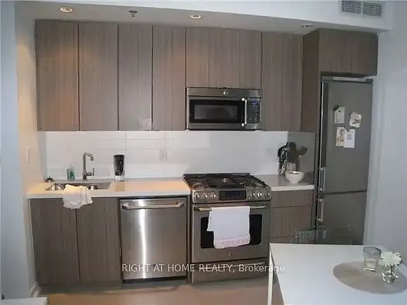 In the heart of Leslieville.Lots of light and 9 foot high ceilings on the fifth floor of a six storey building.Beautiful reclaimed brick feature wall.Sliding glass doors for the bedroom can be completely enclosed. Can fit a up to a queen size bed plus a small armoire. Closet in the hall next to kitchen.Walkout to private patio overlooking the interior garden facing east.Stainless steel appliances with a gas stove with a double oven.Amenities include gym, theater room, party room and interior court yard with BBQ.Located in the trendy Leslieville neighborhood, you are just steps away from the best restaurants, cafes, shops, and parks Toronto has to offer.Easy Access to TTC & Major Highways makes commuting a breeze. Onsite property manager and 24-hour concierge.