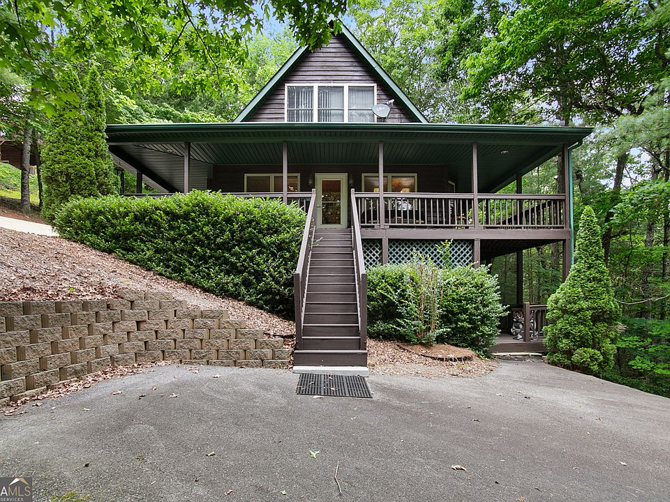 Welcome to your private cabin in the woods with lovely winter Mountain views. This 4 bedroom, 3 bathroom cabin is nestled in a small private community near quaint, Blairsville, Georgia. Wraparound porches beckon friends and family to stay a while. Cozy up, surrounded by tongue and groove to the fireplace on cold winter nights, or, better yet, take a dip in the hot tub. This home features an open-concept main level, and a family room on the terrace level. You will love all the parking space to both upper and lower levels. Only 10 minutes to town. Absolutely perfect for exploring nature as there is the Chattahoochee - Oconee National Forest just around the corner steps away from his home, so bring your ATVs or your hiking boots! Priced Just below appraisal value, come and see this well-kept charming cabin today!