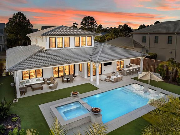 Welcome to refined coastal living in Cypress Breeze, an exclusive gated community just moments from the beaches of West 30A. This custom-built home combines exceptional craftsmanship, modern technology, and timeless design for a living experience that is both luxurious and inviting.Step through the grand foyer where soaring ceilings and a sweeping staircase create a striking first impression. The open-concept great room was designed for both relaxation and entertaining, featuring a cozy gas fireplace, designer lighting, and seamless flow to the outdoors. Expansive glass sliders lead to a private backyard retreat surrounded by lush landscaping. The pool and spa feature stunning fire and water elements, while the outdoor kitchen and bar make it easy to host unforgettable gatherings.