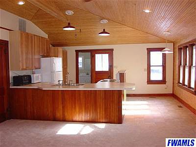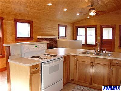 Lakefront 3 bedroom home on Ridinger Lake with full basement. This home has new kitchen w/appliances, bathroom and new flooring. Enjoy beautiful sunsets from the four seasons room overlooking the lake & beach area. Great year around retreat! Front photo taken in summer prior to windows being replaced.