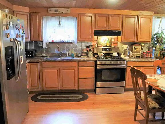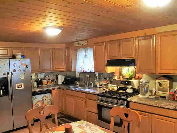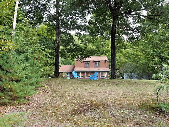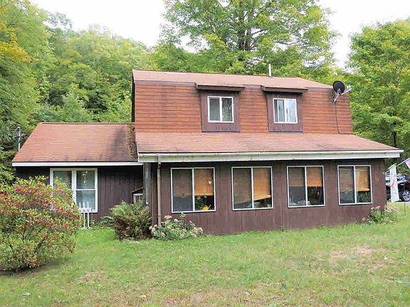 Adirondack Setting home with the sound of the river on a private 1.28 acre lot. Three season sunroom can easily be converted in a year round with french doors. Home has many updated including the kitchen and appliances with knotty pine ceiling and yet with dating details such as stained glass window and homey fireplace. There is 5 bedrooms and 2 full bathrooms as well as a large living room and open concept dining. Outside has a fire pit, over sized barn garage with loft area and tons of potential to make it that extra studio space. Don't miss this home!