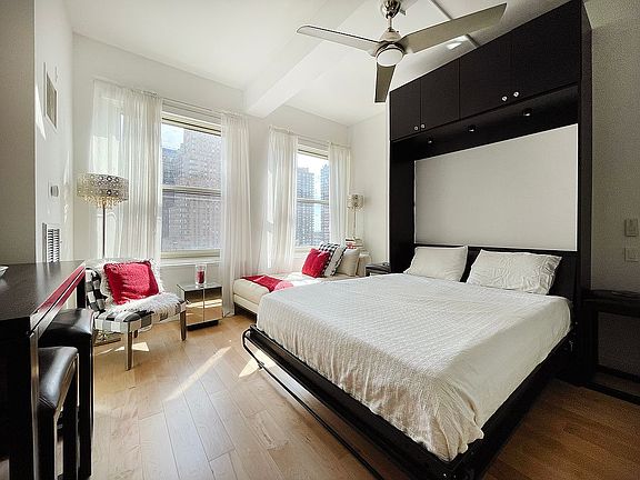 The unit has high ceilings, light oak hardwood floors, ample custom closets, and laundry on every floor. The kitchen is fully equipped with a Sub Zero stainless steel refrigerator, two-drawer Fisher & Paykel dishwasher, and Viking stove and microwave. Google Nest thermostat to control heat and air in the unit. Remote controlled fan installed above murphy bed (queen sized) and newly installed remote controlled shades.