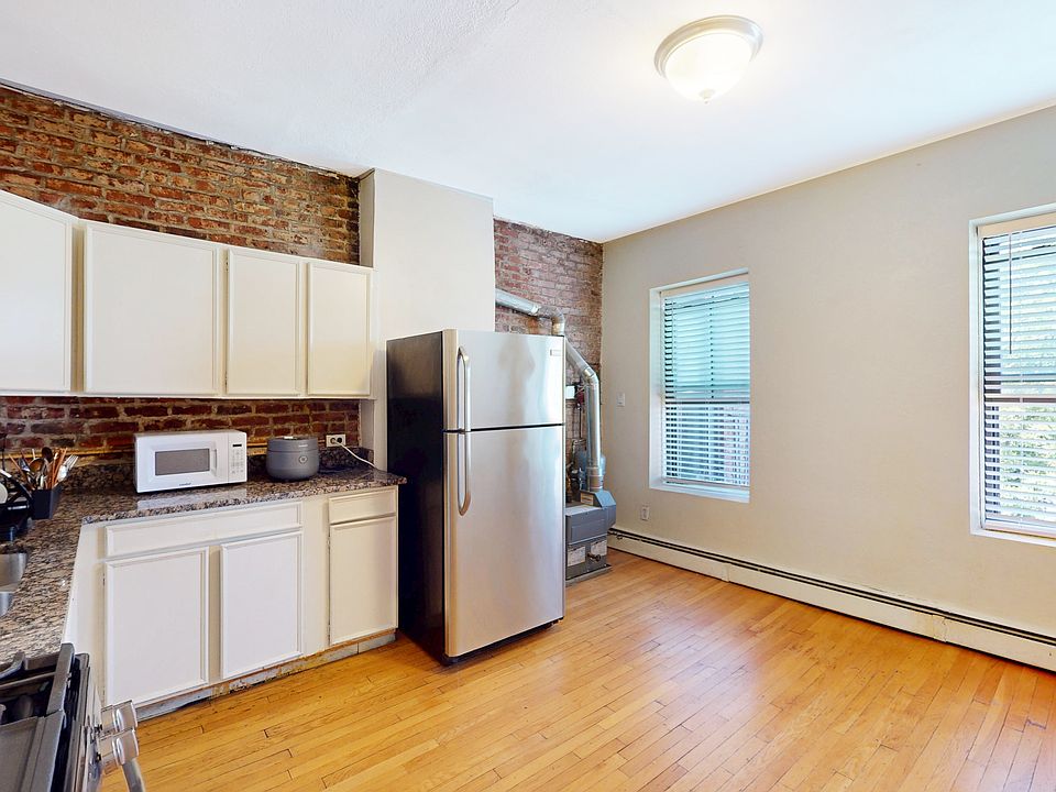Modern bathModern kitchenExposed brickHardwood floorsStainless steel appliancesHigh ceiling