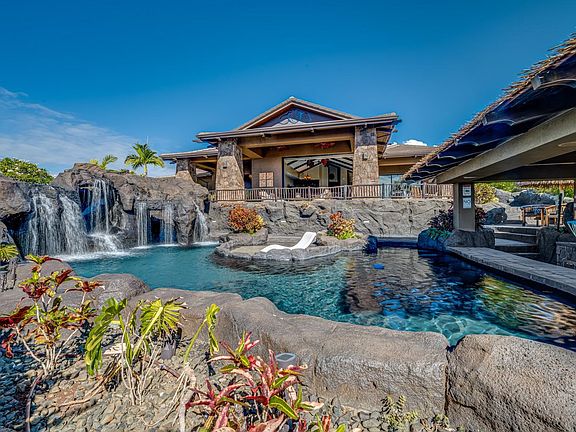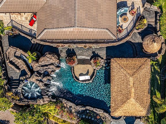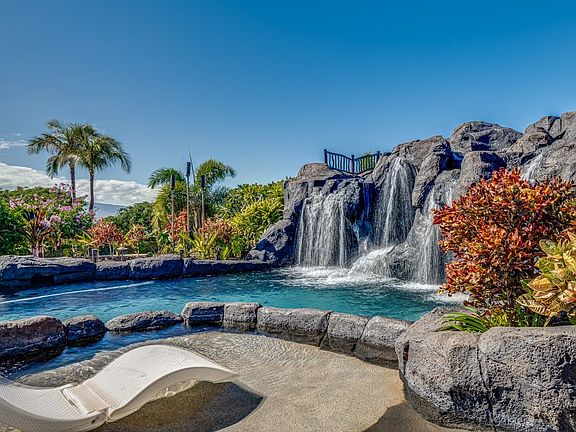 Located at the end of a quiet cul-de-sac in the double-gated Lanikeha neighborhood in the Ka'anapali Golf Estates, 88 Keahilele Place is a testament to luxury, with best-in-class materials and design features found throughout the property. The attention to detail is apparent in the decorative tropical monstera leaf motif woven throughout the home's interior and exterior, including a backlit leaf on the roof. Other first-class finishes include Brazilian Acacia hardwood flooring and Mahogany door trims. The home's large Great Room is the focal point of the interior and looks out to the resort-like lanai and pool area. The inside and outdoor spaces are connected via automated sliding oversized pocket Fleetwood doors that retract to create an expansive indoor-outdoor living space perfect for entertaining. The luxury-class kitchen is designed for the serious home cook. Appliances are best-in-class and include a sizeable side-by-side Sub-Zero refrigerator, multiple Sub-Zero freezer drawers, two double Wolf ovens, and a Wolf 6-burner stove with a griddle. The top-of-the-line Mugnaini wood oven is a standout feature, shipped to Maui from Italy! Finishing touches in this dream kitchen include Mahogany cabinets, rare Cosmos granite countertops, and an oversized walk-in food pantry for dry goods, ingredients, and cooking supplies. The dining area features a 50+ bottle wine wall to safely store your wine collection. The regal kitchen and living area will quickly become a much-loved heart of the home. The home has four bedrooms and 3.5 baths. The master suite opens onto the lanai and has a spa-like bath, complete with an overhead-fill basalt tub, bamboo ceiling, two separate sinks, and two private powder rooms. Another bedroom has a spacious en-suite full bath, while the third and fourth bedrooms share a Jack-and-Jill entrance bathroom complete with a walk-in shower and double sinks. The home also has two bonus office rooms that support a remote-work lifestyle and double as temporary bedrooms if needed. You can keep up with daily exercise routines in the home's fitness room. Outside, 88 Keahilele Place feels like a mini resort! The dramatic and playful exterior amenities rival the home's luxurious interior features. The oversized lanai and pool area are bordered by a custom Ohia wood railing sourced from the Big Island. The elaborate rockwork was crafted by the same company that designed Disney's Aulani Resort on Oahu, complete with a hidden Mickey in the pool grotto! The resort-style pool has multiple waterfalls, a waterslide, and a swim-up bar in the cabana area. Custom details channel Hawaiian motifs, including the steps leading into the pool, which are shaped like the Hawaiian Islands. The pool is gas-heated and salt-capable, and a Pentair filtration system maintains the water quality. In the evening, dramatic lighting effects create a magical setting. A Grillery charcoal barbecue is positioned under the massive, covered cabana adding to the first-class outdoor amenities. The luxury grill area is designed to bring out your inner grill master, with pull-out fridge draws and Puka lava rock countertops. Rounding out the 5-star amenities of this luxury home is the 14-person theater and billiards room. The house has a state-of-the-art Sonos sound system controlled by Control 4, ensuring you can always set the perfect mood for parties or quiet nights at home. 88 Keahilele Place is gated and walled, and the large backyard presents the opportunity to add an Ohana. The home has an owned 52-panel PV system, which supports electric needs and includes net metering; there is room to install additional panels to increase energy production. There are also two solar water heaters. An oversized, three-car garage provides plenty of space for vehicles, toys, and general storage. This is the first time this incredible custom luxury home has been on the market. The home is being offered for less than replacement value, so schedule a showi