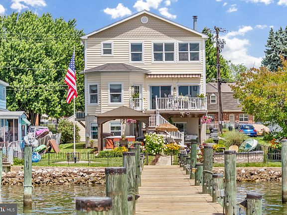 NEW PRICE! Welcome to your dream waterfront retreat! This stunning and meticulously updated Middle River home offers a lifestyle of luxury and serenity with its unparalleled views and thoughtful features. Perched on a prime location, the home is uniquely sited to provide unobstructed vistas east to the Chesapeake Bay and west and south along the widest portion of Middle River. Enjoy true Southern exposure, basking in sunlight from dawn to dusk and relishing both sunrises and sunsets from the comfort of your home, deck, lawn, or pier. It's the perfect spot for watching 4th of July fireworks and the annual Middle River Parade of Lighted Boats. Boating and water enthusiasts will enjoy the deep-water pier equipped with a 20,000-lb lift, perfect for larger boats, and quick access to the Chesapeake Bay, and a separate launch for kayaks and jet skis. The property is ideally situated in a sheltered spot, providing protection from the open water’s choppy conditions. Outdoor living is a breeze with a low-maintenance deck, a charming swinging sofa, a large gazebo, and a patio/fire pit close to the water’s edge, offering diverse seating options in both sun and shade. The lush, tasteful landscaping features beautiful flowering plants, and the rip rap shoreline ensures lower maintenance than a traditional wood bulkhead. Inside, the home is an entertainers dream and a masterpiece of thoughtful and tasteful updates, featuring walls of windows that frame stunning water views from the primary suite, living room, kitchen, and lower-level rec room - most windows with plantation shutters. On cooler days, cozy up in the living room by the pellet-stove fireplace. The custom, updated kitchen is a chef’s delight, featuring an island prep area with a beautiful view, soft-close drawers and cabinets, quartz countertops, and stainless steel appliances. A main-level bed and half-bath can pull double duty as a guest suite or perfect work-from-home office space. All bathrooms have been updated, and the upper level features generous bedrooms with carpet for warmth underfoot and a convenient upper-level laundry. The lower level offers heated tile flooring in the expansive rec room area, and a shelving-lined storage area that’s perfect for keeping organized. Solar panels provide tremendous year-round energy savings. Life on the peninsula provides a coastal vibe with proximity to shopping and main commuting routes, making this property a perfect blend of convenience and tranquility. Don't miss the opportunity to own this extraordinary waterfront property that offers an unparalleled lifestyle for those who love the water. Schedule your private showing today and experience the best of Middle River living!