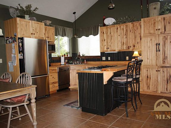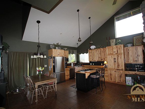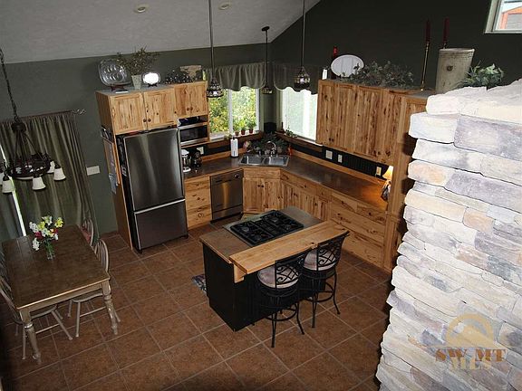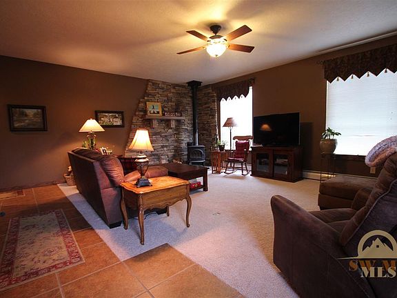 Custom home with large lot and great views. Home has a main floor master with a nice size sitting room that could also be used for an office or exercise room. Open floor plan with huge vaulted ceiling and stacked rock accents in the dining room and master bathroom. Upstairs has two bedrooms with a jack and jill style bathroom and an extra room. The garage has a partially finished bonus space that could be finished into a guest quarters, family room or home office. Nice front porch and mature trees.