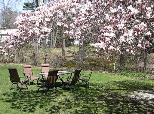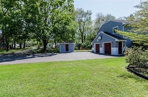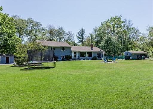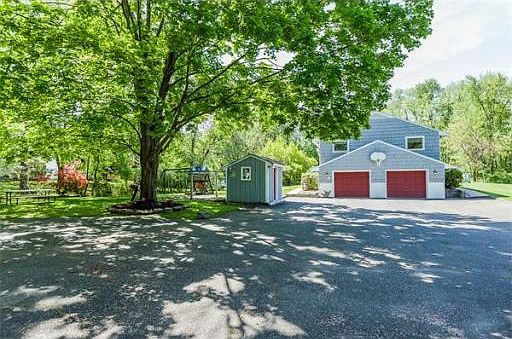 Privacy and a woodsy setting all around you in this well-maintained custom-built 4-bedroom Contemporary; open floor plan with windows and light (two 7-foot picture window overlooking sweeping green front lawn) and gorgeous hardwood underfoot. Kitchen w island, new countertops, sink & faucet, mosaic tile backsplash opens to spacious dining area. Sunporch off pool with updated tile floor and 3 sets of sliders overlooking deck and pool. Wood stove plus separate fireplace in living room w hardwood floors and custom windows in front of solitude of woods. 4 garage bays (2 attached, 2 detached) means space for workshop, ample storage for toys or boat or both. Finished basement with full bathroom. Updated half-bath off entry area. Flowering trees, shrubs thru all over. Beautiful appointments, space, custom stonework (fireplace) across nearly 3,400 of living area (APO). Teak patio, huge retractable awning, and a no-liner in-ground pool for parties & cookouts. Hidden from the road.
