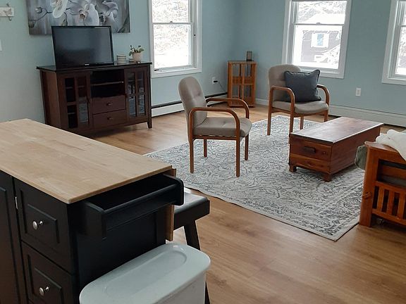 This beautiful, sunny apartment is fully furnished, including dishes, cookware, and one queen bed. The living room, dining, and kitchen are open and there is a private deck and a dedicated parking area. Washer and dryer in apartment for use. First month's rent and security deposit are due on the date of lease-signing. Plowing, wifi, water, and heat are included; electricity to be paid by the renter. No smoking in apartment or on premises.