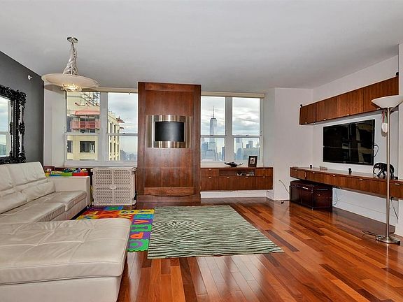 Luxurious 2 bedroom/ 2 bath penthouse with panoramic views of NYC! Stunning unit features dark hardwood floors throughout, and direct views of Hudson River, Statue of liberty, and Manhattan skyline. Kitchen boasts stainless steel appliances, wine refrigerator, granite counter tops, and wood eat-in full length breakfast bar. Motorize window blinds with remote, blackout shade in the guest bedroom. Custom daybed with storage, shelving, desk and custom cabinetry in ALL bathrooms and closets. Ethanol Fireplace, buildout on A/C units. Building amenities include 24 Hour Concierge. Fitness Center, Billiards Parlor, Virtual Golf Simulator, Dining Room and Screening Room. Outdoor Heated Pool and Sun Deck. Indoor Aqua Grotto Spa with Sauna and Steam Room.