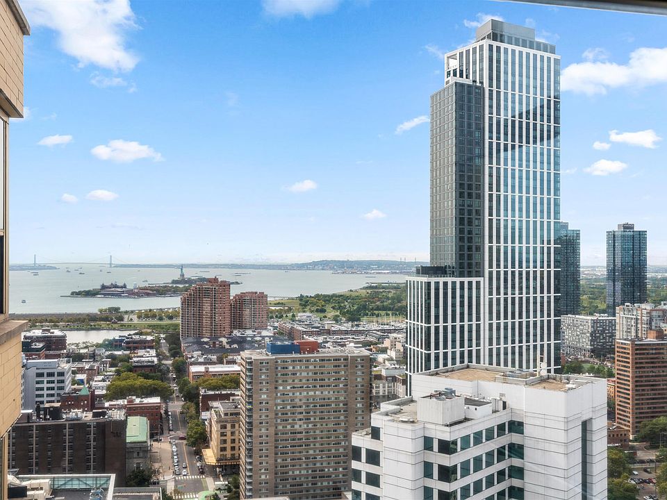 Welcome to 88 Morgan Street Residences - where luxury meets convenience. Perched on a high floor, this NEWLY RENOVATED and expansive 1-bedroom apartment offers an elevated living experience with soaring 9'5" ceilings that create a bright, airy atmosphere. Southern and western exposures fill the home with natural light and showcase stunning views of the Statue of Liberty and Jersey City skyline. The open-concept layout is ideal for both relaxation and entertaining. The chef's kitchen features sleek white cabinetry with elegant gold accents, a beautiful backsplash, modern appliances including a brand new refrigerator, and ample storage. The spa-inspired bathroom provides a tranquil retreat, while wide-plank hardwood floors and generous closet space add to the comfort and appeal. An in-unit washer/dryer offers everyday convenience. 88 Morgan offers an unparalleled suite of luxury amenities, including a rooftop terrace, outdoor pool, fitness center, jacuzzi and aqua grotto, saunas and steam rooms, business center, screening room, golf simulator, and a private dining room with a chef's kitchen. Ideally located with easy access to the Light Rail, NYC ferries, and all PATH trains, just minutes to Manhattan. Whole Foods Market is just one block away for all your grocery needs. Please note: no pets allowed. Rental parking is available.