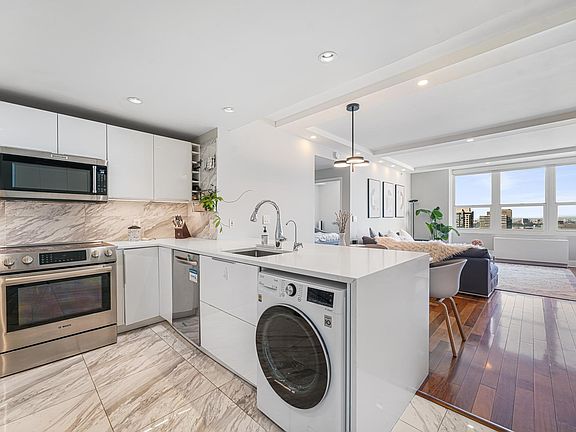This pristine Penthouse 2-BR/2-BA residence is housed within one of the Hudson Waterfront’s finest luxury buildings. A brief entryway leads to this sophisticated home featuring North and East exposures with breathtaking Hudson River, Midtown Manhattan and Freedom Tower panoramic views, abundant natural light all day long and generous living and storage space. This floor plan offers one of the most efficient layouts in this area without an inch of wasted space, making it feel way more than 1200 Sq Ft. Custom motorized Hunter Douglas window shades in all rooms and custom closet systems maximize storage in all closets. Upgraded lighting features include recessed lights in all rooms, a modern ceiling light in the dining area and LED lights in both bathrooms. Pristine hardwood floors abound throughout this exquisite residence. The open plan living area features a generously proportioned U-shaped kitchen with custom white high-gloss cabinets, Porcelanosa tiles as kitchen flooring and backsplashes, and white quartz countertops and waterfall kitchen island which flow seamlessly into the dining area and living room. Built-in rotating Lazy Susans, walnut cabinets built-into the kitchen island end panel, and the custom white high-gloss pantry+coat closet combo at the entrance add up to a both beautiful and practical kitchen. Newly replaced top-grade appliances include LG Compact All-In-One W/D, Bosch Oven Convection Range, and KitchenAid Microwave. With an optimized layout, the master bedroom suite provides a gracious sense of space and light with multiple oversized windows with Freedom Tower and Midtown Manhattan views, a custom walk-in closet, and the perfect space for a nursery or a study. The en-suite master bath features sliding-door entry, and Porcelanosa shower panel and full body massage shower system with rainshower head in the en-suite bathroom. The guest bedroom also offers generous space, great views, and a flexible layout that will accommodate a king-sized bed. Both bedrooms provide recessed ceiling lights, massive walk-in closets, and motorized blackout window shades. 88 Morgan Street is a full-service building featuring 24-hr concierge and doorman, on-site super. 41,000 sq. ft. of amenity space features a lounge, business bar, game room, media room, demo kitchen and kids room which were newly renovated in 2019 with luxurious new portals, cabinetry, Italian marble surfaces with customized state-of-the-art lighting and all new furniture and decor. Amenities include one of the area's best equipped gyms, children's outdoor playground, heated outdoor pool, cabanas, jacuzzi, dry and wet saunas, billiard room, golf simulator, ping pong room, etc. This superb location is conveniently located blocks from top rated Cornelia F Bradford Elementary School, Harborside Park, ShopRite, BJ’s, shopping and dining. Whole Foods will open one block away in 2022. Ferry to NYC, Exchange Place & Grove PATH stations, and the Harborside Light Rail Station are at doorstep. CVS, CycleBar, and cafe on premises. Garage parking is available for rent at $321/m.