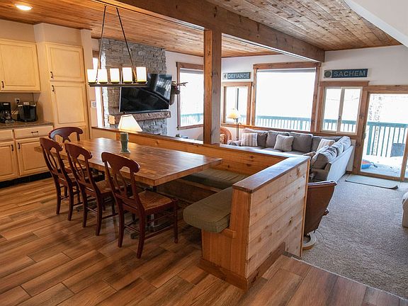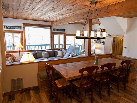 This exceptional four-bedroom plus loft direct slopeside townhome offers views of the Upper Sachem trail from every level as well as long-distance mountain views to the east. Updated kitchen includes stainless steel appliances and granite countertops. Sunken living room with woodburning stone fireplace accented by exposed beam wood ceilings leads out to a wraparound deck overlooking the slope. Four well-proportioned bedrooms, one en suite, plus an additional bonus room. Separate family room with slate surround wood burning fireplace and dry bar. Oversized loft with cathedral wood ceiling. Three and one-half baths, all updated. Updated flooring, appliances, doors, and hardware throughout. Most windows have been replaced. Private ski closet. Easy walk to community amenities.