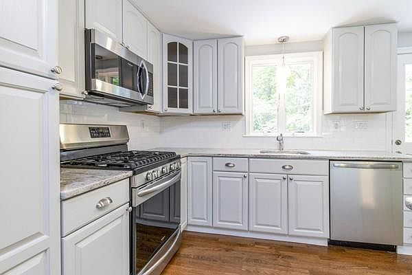 Open Houses have been cancelled! An Offer has been Accepted!! Welcome Home to this beautiful Fully Renovated Raised Ranch featuring a Stunning eat in Kitchen with a large center island, granite countertops that compliment the gorgeous white cabinetry and Stainless Steel appliances. 3 good sized Bedrooms with generous closet space and 1 full bath complete the upper level. Downstairs is a large area as well and it has its own office room, spacious bedroom and a family room with a brick fireplace plus all New wall to wall carpeting. 1 full bath downstairs has a great space for a washer/dryer and plenty of cabinet space above. More NEW Features include Roof, Windows, Front Door, Lighting Fixtures, Azec Deck, Driveway and Walkway, Garage Door opener. Located very close to the center of Canton and Canton High School. All amenities are close by including shopping, train, restaurants and more. This House is a Must See!