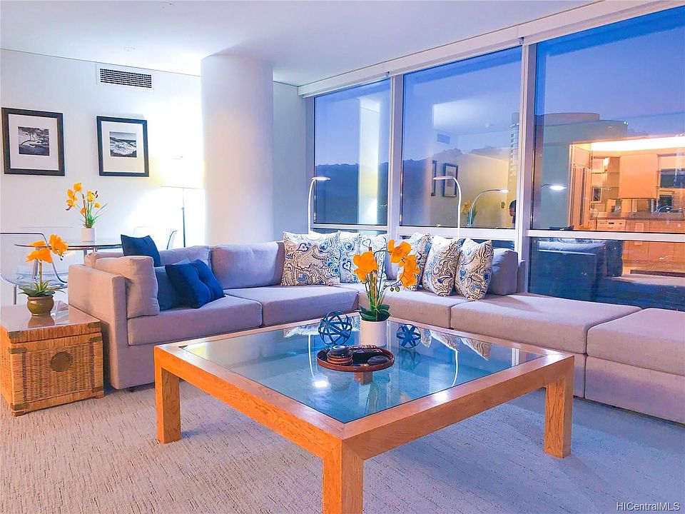 BEST STACK IN THE BUILDING! Your chance to live in the famous Hawaiki Tower! Spectacular 2 bedroom/2bath condo with amazing unobstructed views of Waikiki, ocean and mountain views; fantastic show of fireworks every Friday night! Across the street from the mall, short walk to Ala Moana Beach Park and Magic Island, shop at SALT and Whole Foods, easy access to the freeway and town. This is a floor to ceiling panoramic view unit, electric drapes and cross ventilation! Building amenities include: putting green, tennis court, bbq area, infinity pool, jacuzzi, large grassy area. Secured 2 stall parking and 24 hr security. Extra 52 sq foot enclosed lanai! Sorry NO Pets, not EVEN FISH! $20 application fee for EVERY adult! 6 Month MINIMUM LEASE, 9 MONTH MAXIMUM. 8 guest parking stalls. Please contact Kim for a showing!