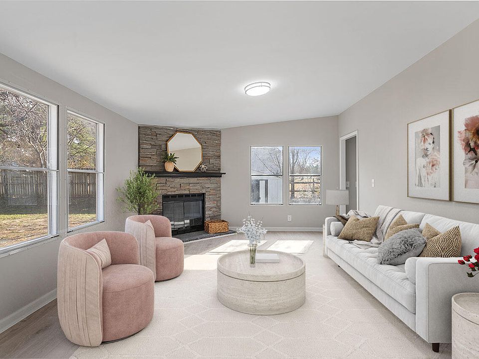Beautiful Ranch with a bright open floor plan and upgrades galore! Features a custom designed kitchen with new cabinets, island, granite countertops, tile backsplash and stainless steel appliances. Wide plank flooring throughout the main living areas; PLUSH carpet in bedrooms, and new interior paint. AMAZING Primary Retreat with large WIC, dual vanity, HUGE walk-in shower and soaking tub! Move in and enjoy! Staged photos for illustration only, to show homes potential.
