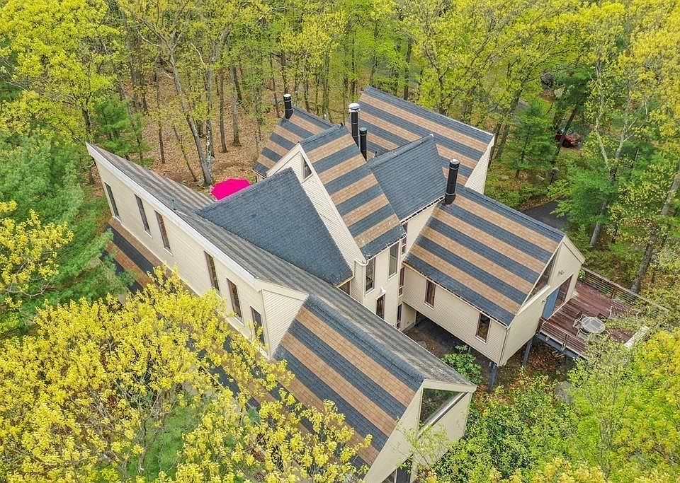 An artistic treasure in the forest! Geometric shapes, hand-painted tiles by renowned artists Gail Boyajian and Lisa Houck, and natural landscapes grace this mid-century modern home in a wooded private setting in Prime Precinct 1. The thoughtful orientation of the house maximizes the site's natural light and landscape. The floor plan revolves around a dramatic open central staircase. High ceilings, wide expanses of glass invite the outside in. Step out onto the decks that wrap around the second floor looking out at the treetops, it feels like living in a treehouse. State of-the-art kitchen/family room with gas fireplace. Entertain larger gatherings in the spacious living and dining rooms. Home office with separate entry has surround sound and excellent acoustics, perfect for an audiophile. Some A/C. Convenient to everything! A hip village center, fabulous private schools, Legacy Place, University Station, commuter rail to Boston, Providence & NYC. Convenient to all. Discover Dedham!