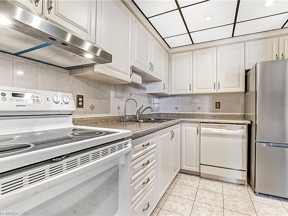 Welcome to Spruce Lane Condominiums—a beautifully maintained, secure building in Brantford’s desirable North End, offering comfortable, worry-free living ideal for those looking to simplify without compromise. This bright and spacious 977 sq. ft. fourth-floor condo features 2 generously sized bedrooms and 1.5 bathrooms, thoughtfully designed for everyday ease. Large windows throughout fill the home with natural light, while elegant flooring enhances the welcoming living and dining areas—perfect for quiet evenings or hosting family and friends. The functional kitchen offers ample cabinetry and flows seamlessly into the dining area, creating a cozy and practical space for daily meals. The primary bedroom is a peaceful retreat, complete with a large bay window, walk-through closet, and private ensuite. The second bedroom is ideal for guests, a home office, or hobby room. Step outside onto your private balcony, overlooking greenery—an ideal spot for morning coffee or relaxing in the fresh air. Enjoy year-round comfort with an updated furnace and air conditioning, plus the added convenience of in-suite laundry and all appliances included. This well-cared-for building offers excellent amenities including a secure entrance, fitness room, sauna, party room, library, storage locker, garbage chute on every floor, and assigned parking. Condo fees include water, adding peace of mind and predictable monthly costs. Ideally located minutes to Highway 403, shopping, golf, parks, and everyday amenities—this home combines tranquility with easy access to everything you need. Immediate possession available and priced to sell. A wonderful opportunity for comfortable, low-maintenance living in a welcoming community.