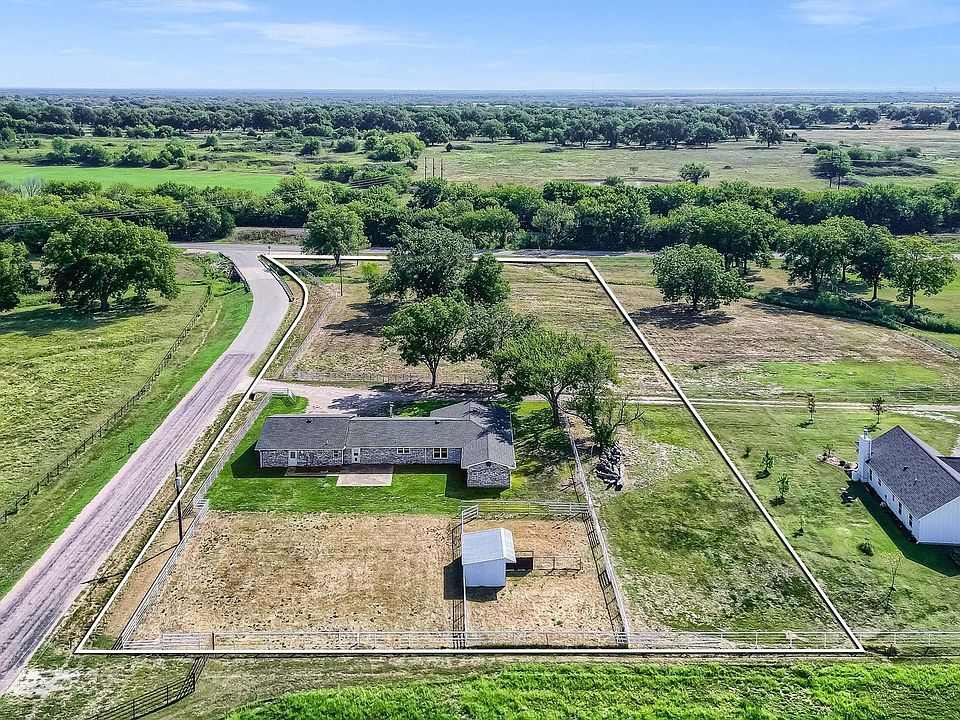 This hard to find 3 Acre property includes a 2335 SQ FT 3 Bed, 2.5 Bath brick home. His and Hers closets in the primary bedroom as well as a built in Safe Room! Modern Rustic den including a wood stove for cozy nights and the built in bar is great for entertaining. Oversized 2 car garage with room to have a work area. Bring the livestock and horses! Outside you'll find the fenced and cross fenced property with a 2 stall run-in shed and paddock. Mature pecan trees and some of the best sunsets North TX has to offer.