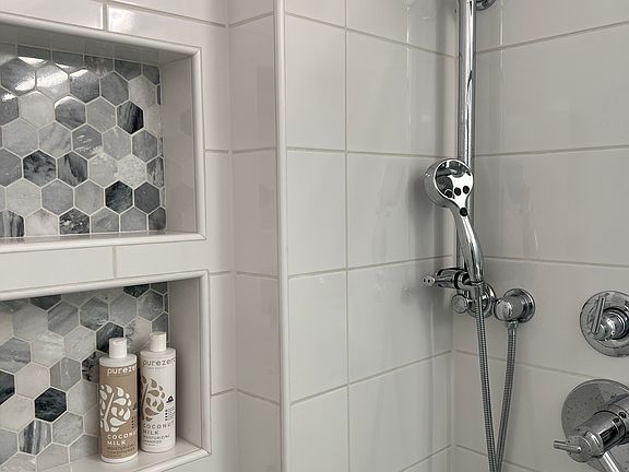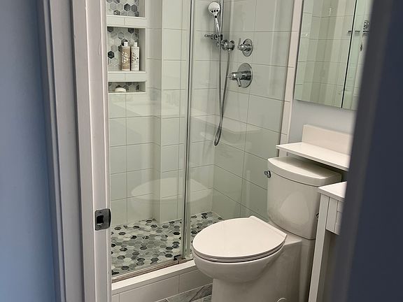 Spa Quality Marble Bath: Enjoy a stunning all marble bathroom with frameless glass shower, chrome fixtures, and an oversized mirrored cabinet for storage.