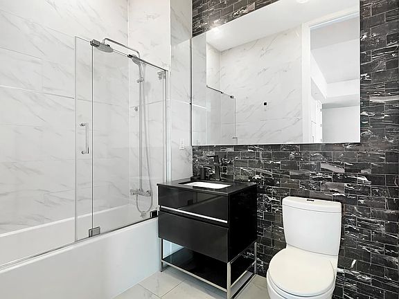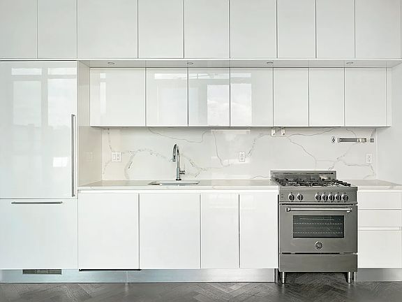 A stunning kitchen features gloss white custom Italian Scavilini cabinetry and quartzite countertops, with appliances by Bertazzoni and Bosch. The bathroom includes a black marble vanity and matching marble paneling and backsplash. All fixtures are by Toto and Grohe. Full stackable Bosch washer/dryer in unit.