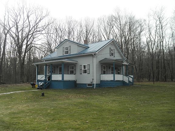 Property backs up to State Game Lands. 2 covered porches, livingroom with electric fireplace, dining room, eat in kitchen, laundry/mud room, half bath on first floor. 2 bedrooms ( Could possibly be 3 bedrooms ) and full bath on 2nd floor. 2 stall concrete block garage shale floor and a 1 stall garage with storage.