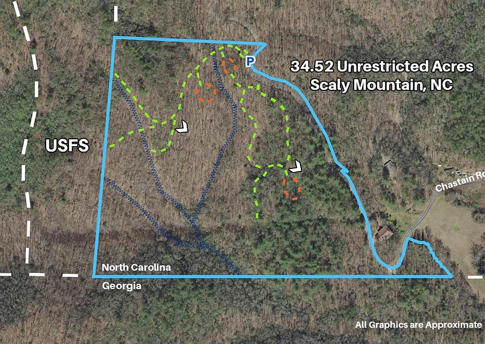 Discover 34.52 Unrestricted Acres Adjoining USFS Land in Scaly Mountain, NC! This is an amazing opportunity to own a large land tract with views, streams, small waterfalls, old logging roads and several gentle areas to camp or build. Old logging roads and hiking trails have just been cleared through the property and over to the Forest Service boundary where over 2,000 acres are waiting to be explored. Bring your hiking shoes and come experience the unparalleled natural beauty.Underground power along the road and a new gravel access drive has just been installed. No Restrictions, No HOA, No Zoning and ready for your dreams. Whether you're thinking of camping/hunting land, premium RV site, tiny homes, vacation rentals or a custom estate home, this unrestricted acreage provides the flexibility you desire. Conveniently located at the peaceful end of Chastain Rd with only one property owner beyond yours to ensure privacy. Don't miss this extraordinary opportunity to buy unrestricted & south facing land adjoining the Nantahala National Forest in the highly desirable Scaly Mountain area. Search the address on YouTube to see the two videos & make plans to see this one before it's gone!