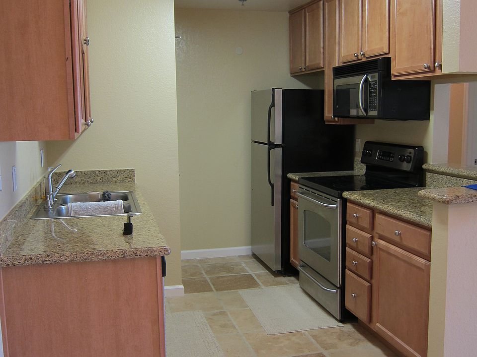 Private balconyTile flooringStainless steel appliancesGranite countertopsAmple storageCherry wood cabinetsSliding glass door